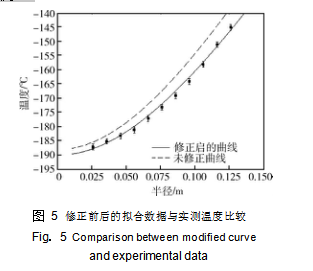 對液氮罐內溫度的初步擬合表明,溫度的計算結果與實測數值間存在一定誤差,鑒于溫度測量所用的鉑電阻探頭的感溫段長度有 22. 0 mm 長,要測的是空間點的溫度,而實際的溫度是該長度上的平均溫度。因此,考慮溫度在這段長度上的變化,取這段鉑電阻的中點的溫度作為實測點的溫度,從而對計算結果進行修正。修正后典型的擬合溫度如圖 5 所示,修正的結果減小了擬合與實測溫度值之間的誤差,提高了擬合的精度。這也可從圖 4 中的結果得到驗證,軸向溫度的實測值與理論計算得到的結果兩者符合得