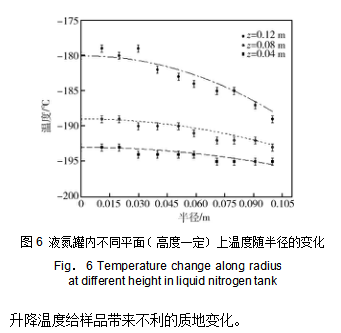 時,可保證罐內空間溫度在 - 130 ℃ ** - 190 ℃ 之間,低于 - 130 ℃ 的時間持續近 25 天。通過控制距離液氮面的高度,合理選擇保存樣品的溫度范圍,樣品的升降溫速度、保溫時間等因素,為各種實際應用提供便利條件。建立的罐內空間溫度模型給出了與實際測量吻合較好的罐內溫度分布,確定方程參數后,可便捷地分析罐內溫度的分布,證實這模型的合理性和